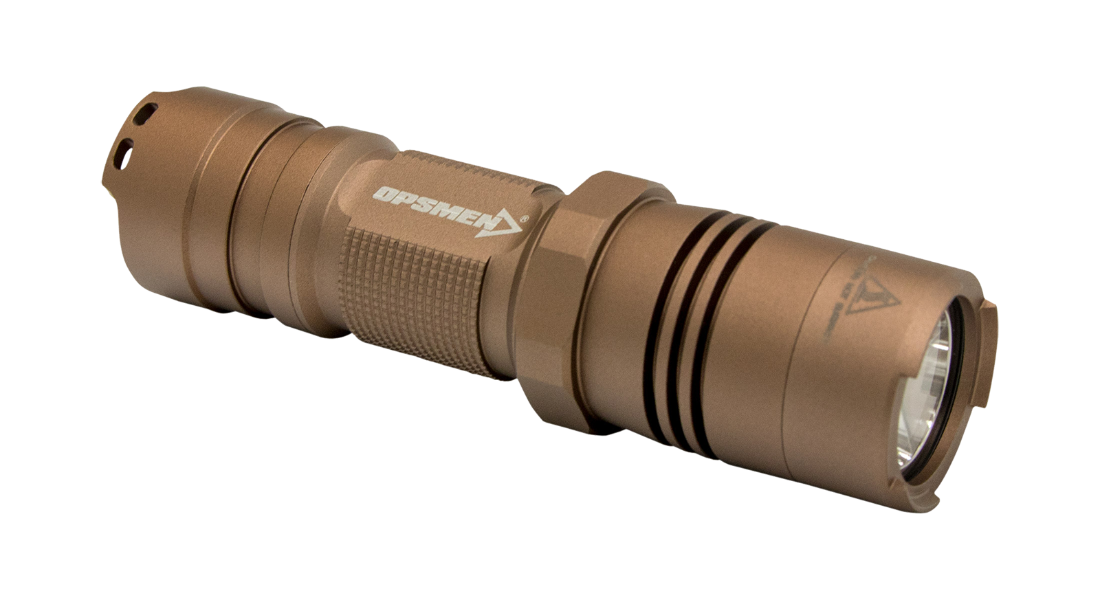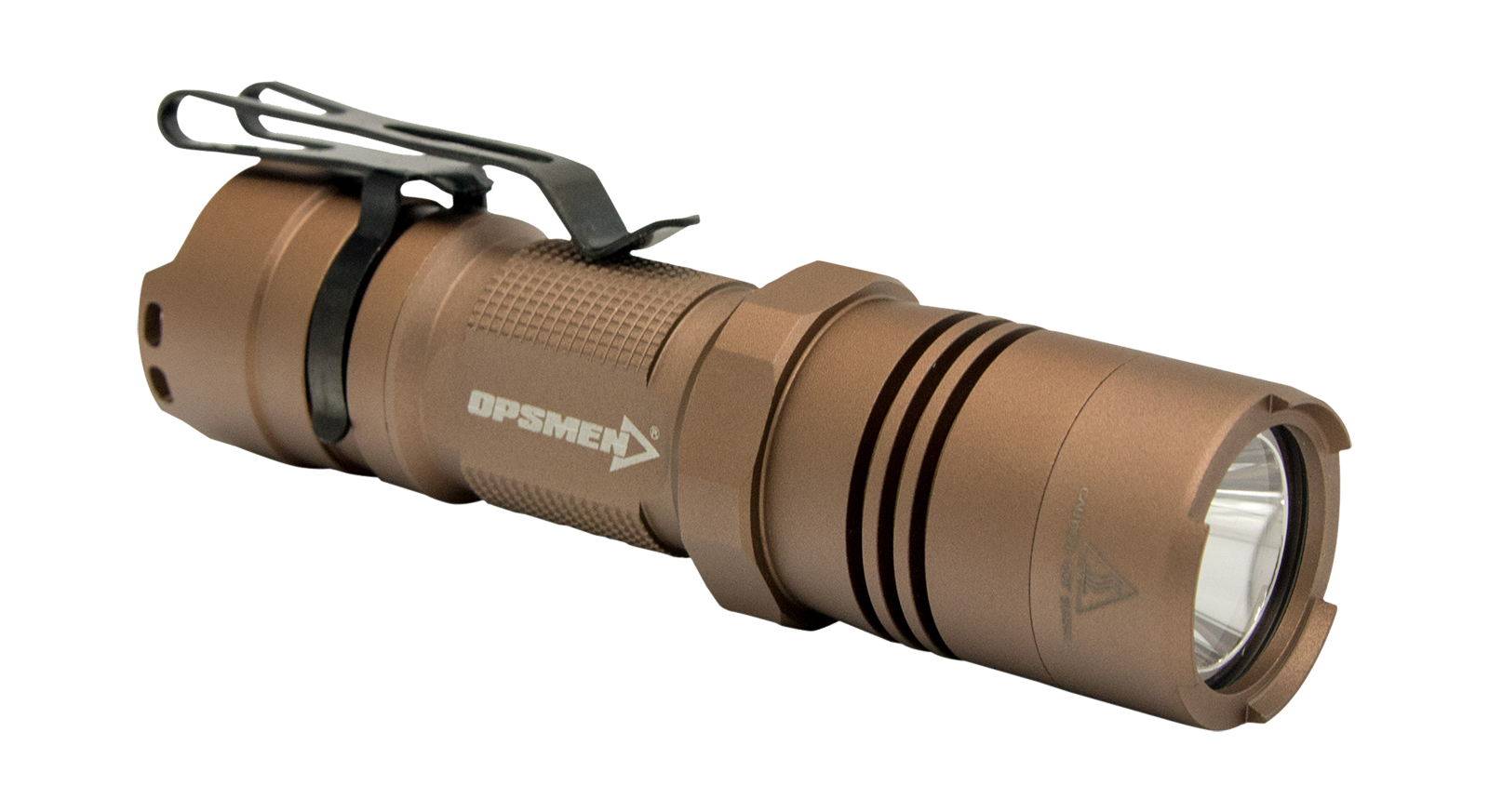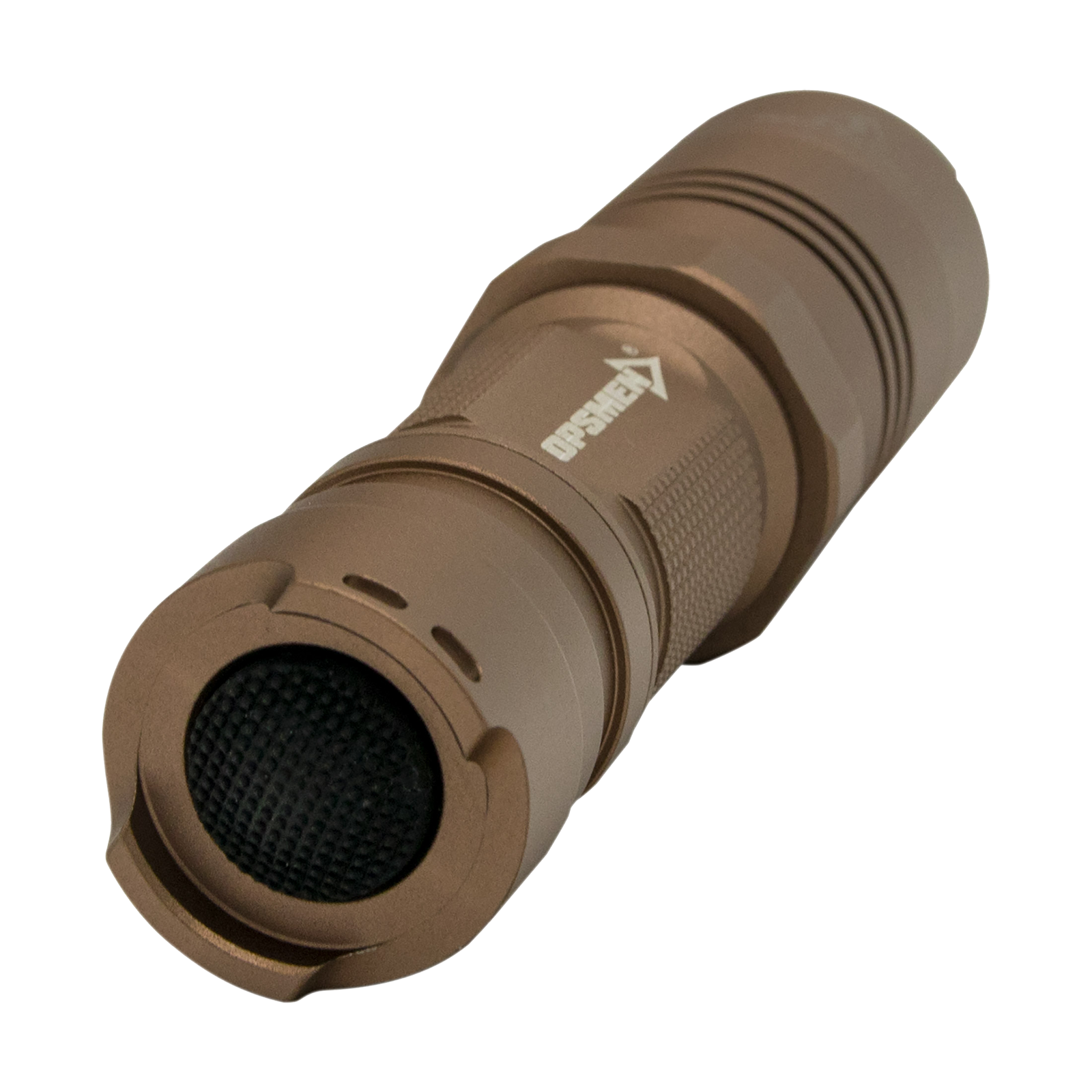 Φακός LED F302 χρώμα TAN. Μέγιστη ισχύς φωτισμού 400 Lumens Λειτουργεί με 1 x CR123A  ή  1 x 16340 Οπίσθιος διακόπτης Σώμα αλουμινίου Κλιπ Ανάρτησης Λουράκι Καρπού Πλαστικό κουτάκι μεταφοράς
